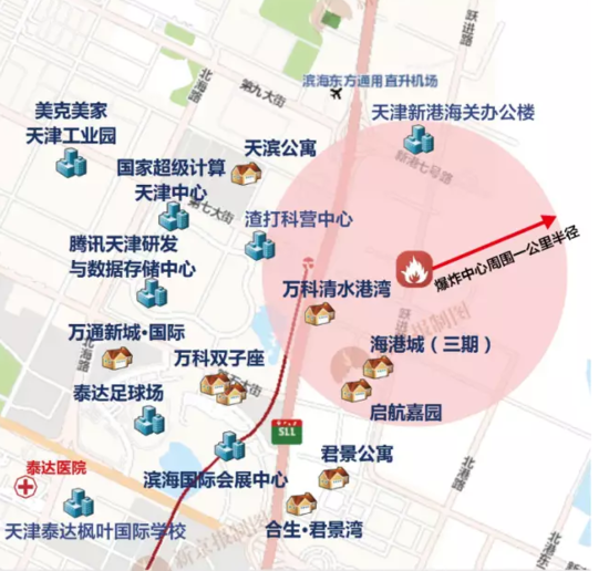 爆炸點(diǎn)方圓3公里分布住宅小區(qū)數(shù)量多達(dá)十五個以上,萬科海港城離爆炸點(diǎn)僅600米。這些居民區(qū)建筑多為高層板樓,居住密度極大,爆炸點(diǎn)周圍1000米內(nèi),有超過5600戶住戶。